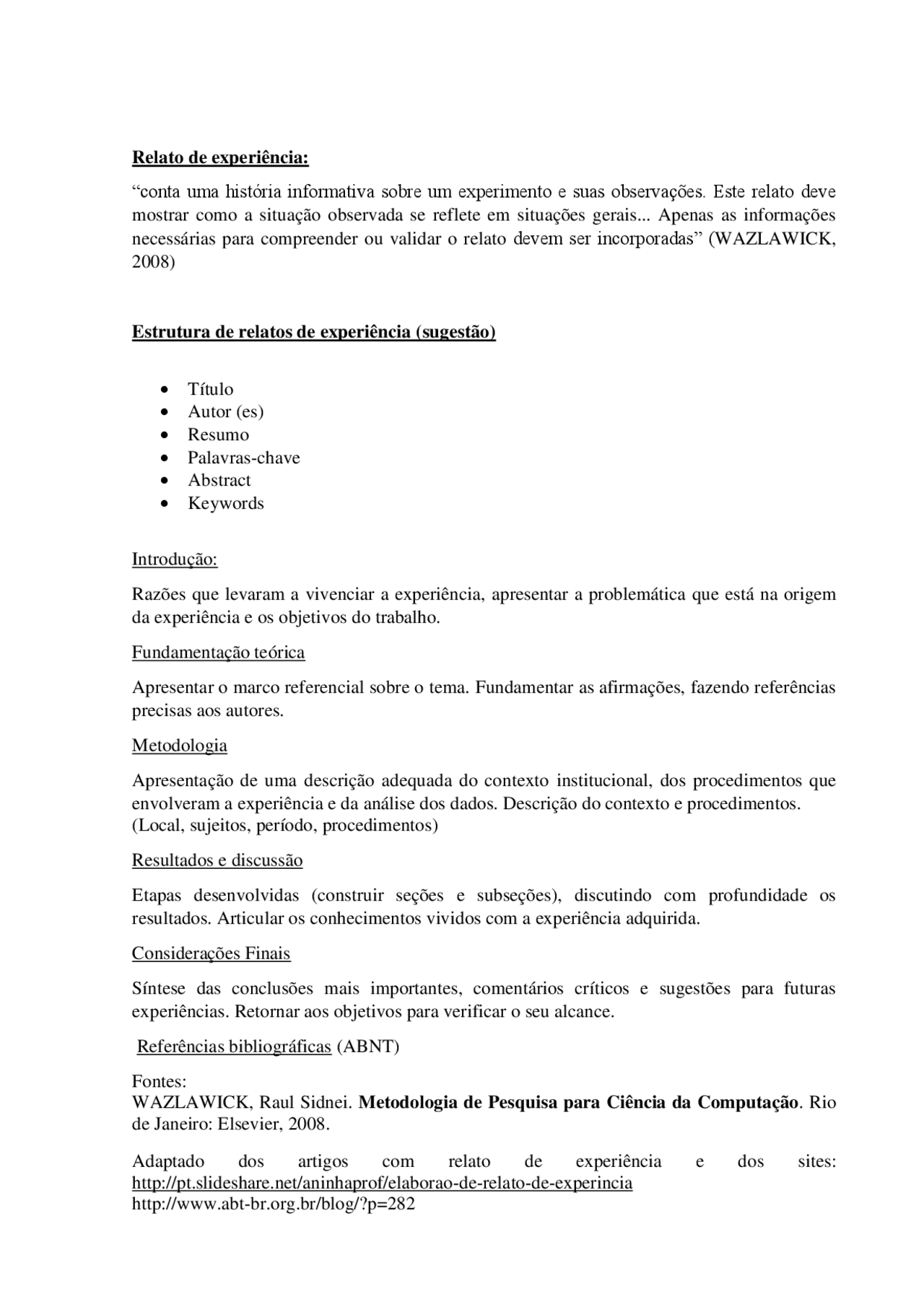 Relato de experiência é um tipo de texto acadêmico onde o autor descreve e reflete sobre uma experiência ou vivência profissional, seja ela exitosa ou não. O objetivo é que esse relato possa contribuir à discussão, troca ou proposição de ideias na sua área de atuação. À primeira vista, o relato de experiência pode parecer uma.