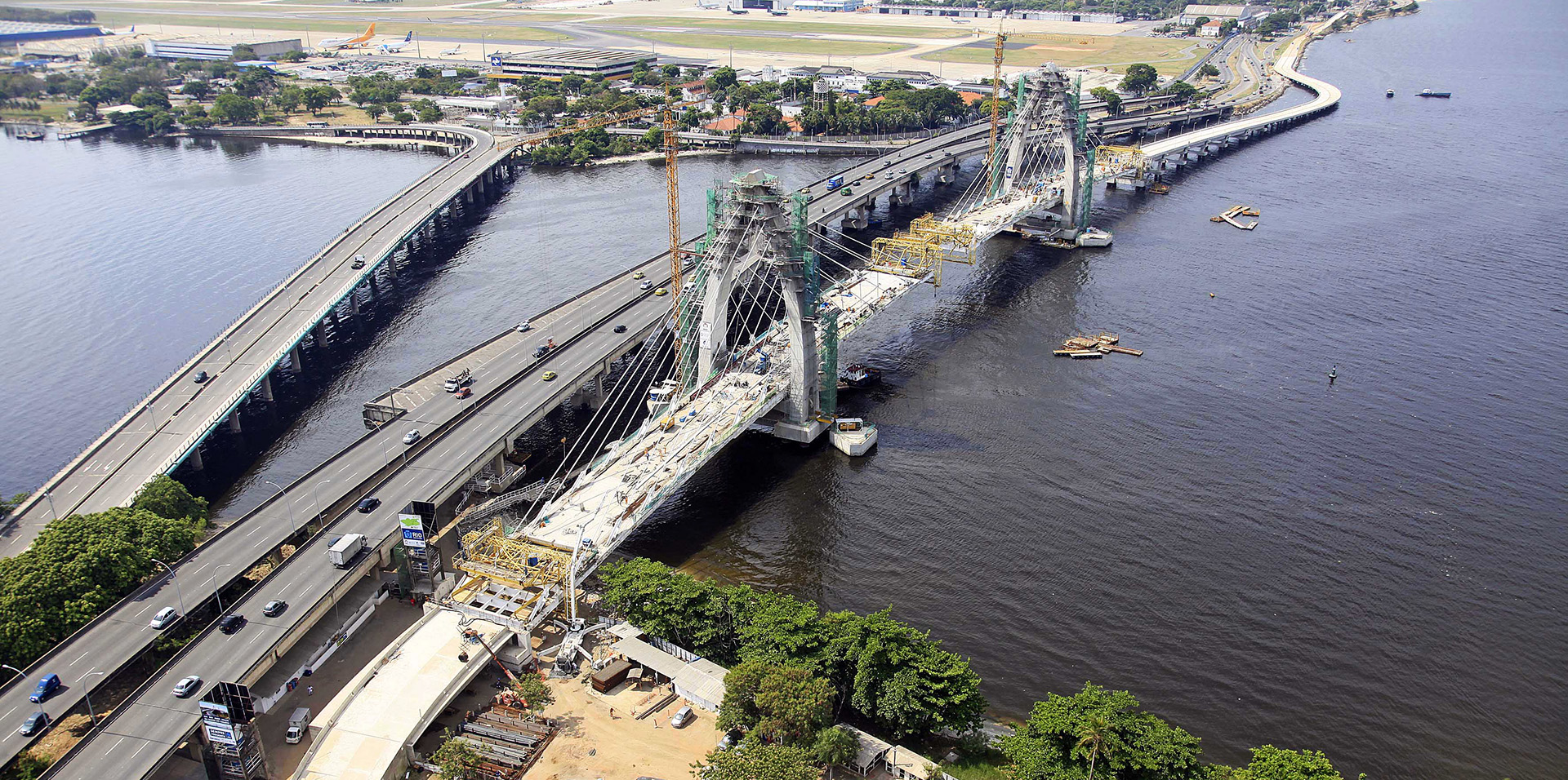 A ponte estaiada Prefeito Pereira Passos liga a Linha Vermelha à Ilha do Governador e integra o corredor de ônibus que faz a ligação entre o Aeroporto do Gal.