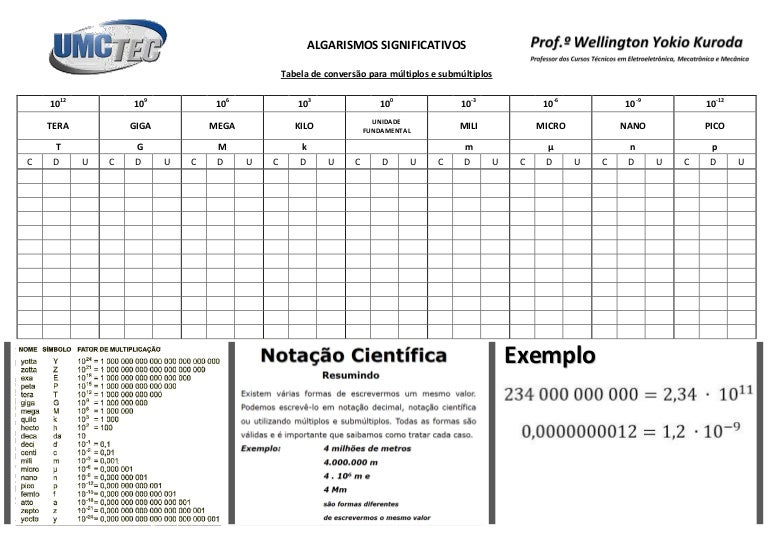 Tabela para conversão de múltiplos e submúltiplos